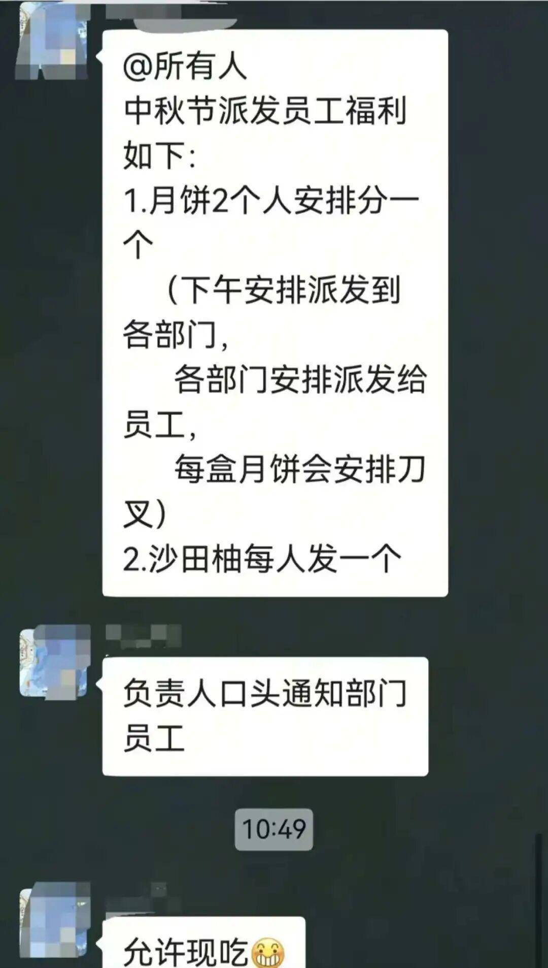 另有部分发布者展示的聊天截图显示,此次发放的物品为“中秋节员工福利”,需要员工两人分一个月饼,另外每人会有一个沙田柚。